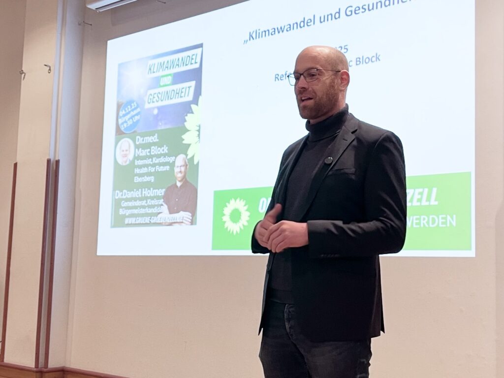 Dr. Marc Block, Hausarzt und Kardiologe aus Ebersberg, engagiert sich in der Deutschen Allianz Klimawandel & Gesundheit (KLUG) und bei „Health for Future“. Diese Netzwerke informieren überparteilich über Klima und Gesundheit, bauen lokale Initiativen (z.B. Hitzeaktionspläne) auf und bringen das Thema in Medizin, Pflege und Ausbildung ein. In Ebersberg wurden u.a. Wahlveranstaltungen, Symposien und ein großer Abend mit Harald Lesch organisiert.